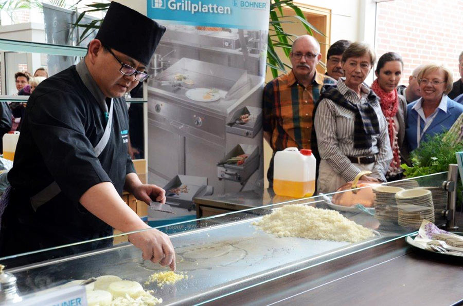 Eines der spannenden Themen u.a. war „Frontcooking“, das Anrichten von frischen Speisen vor den Augen der Gäste, das in der Gastronomie zunehmend beliebter wird und das der chinesische Koch, Xiao Wang, in Perfektion den interessierten Teilnehmern zeigte. Die Teilnehmer konnten sich die Zutaten aussuchen und diese wurden dann vor den Augen aller zubereitet. Vorher hatte Claudia Bohner (Geschäft sführerin der Bohner Produktions GmbH, Bad Waldsee) die gesamte Palette ihrer Geräte vorgestellt und über die Entwicklung auf diesem Gebiet der Zubereitung von Speisen referiert.